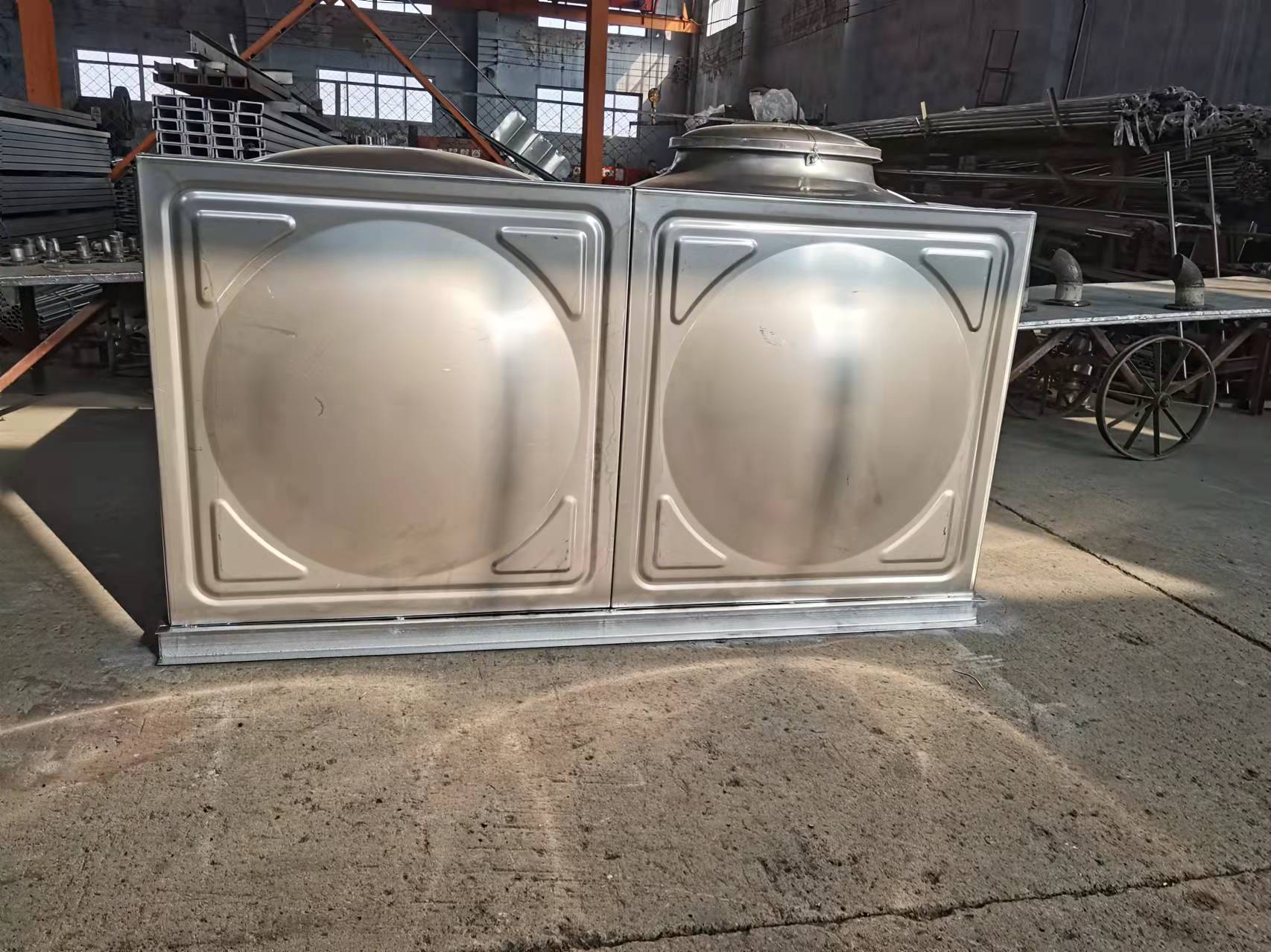 三、水箱內(nèi)外皆有爬梯,頂部留有人孔,方便進(jìn)出清洗,內(nèi)有拉筋,用于穩(wěn)固水箱。