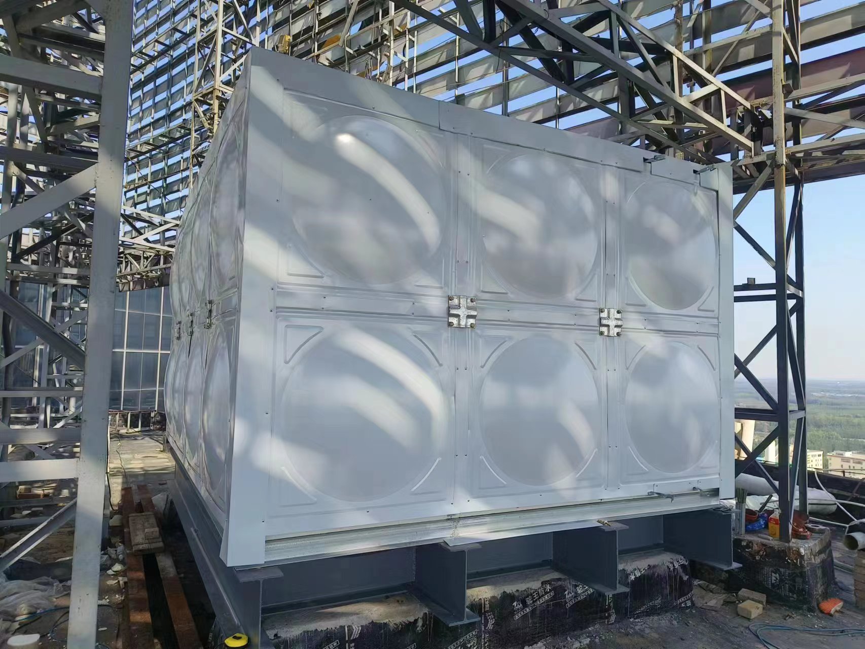 德州德百物流批發城24立方玻璃鋼聚氨酯彩鋼板保溫水箱已經安裝完畢,此次安裝的進度也非常快,在規定的時間內完成了安裝和試水,得到了客戶的認可。您的認可就是對我們鼓勵。